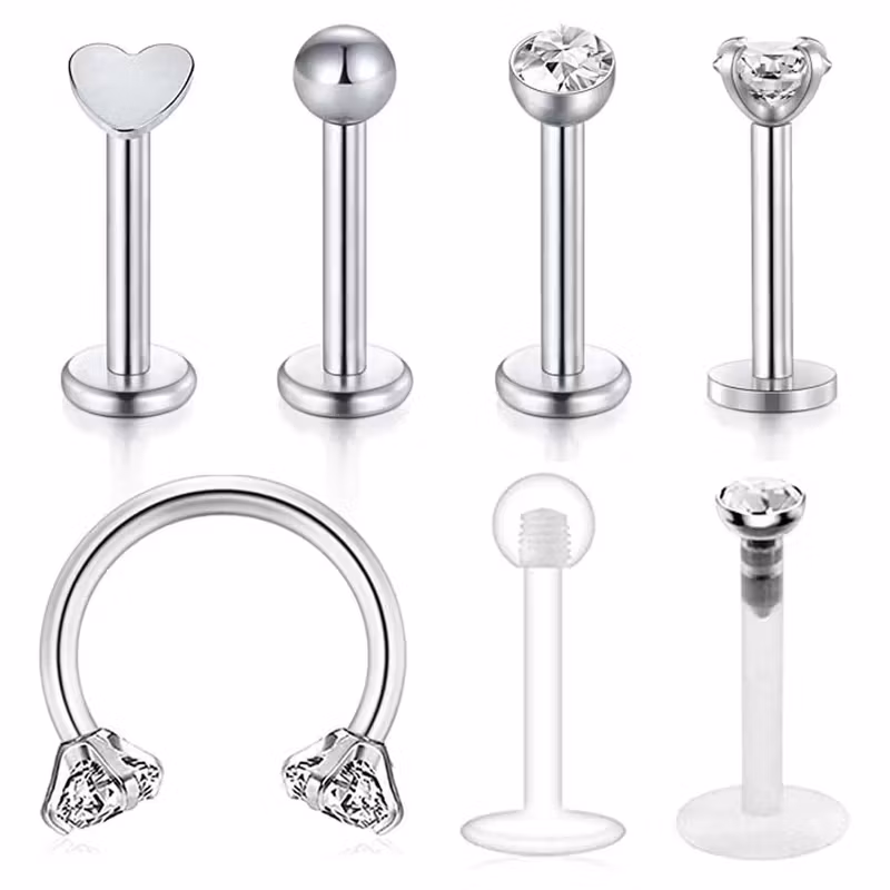 En samling labretpiercingar i olika utföranden, från klassiska kuländar till hjärtformade toppar och glittrande stenar.