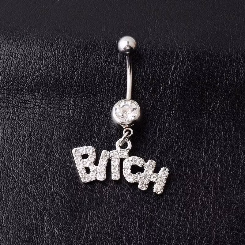 Ett navelpiercingssmycke med en silverfärgad stav och en vit ädelsten i mitten.