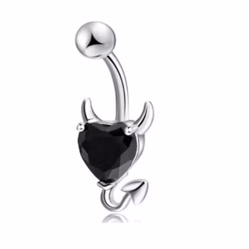 Ett navelpiercingsmycke i blank metall med böjd stav.